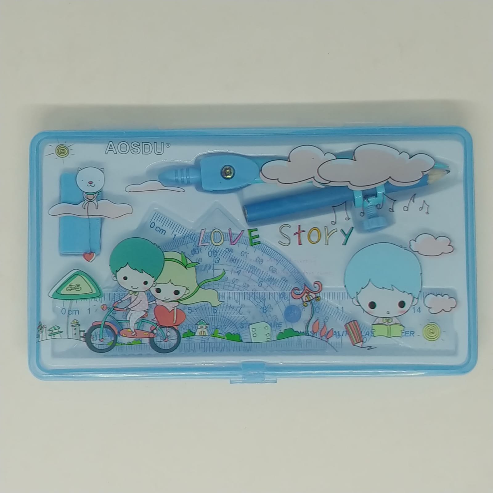 These are geometry set housed in a plastic pencil case, available in both blue and pink color variations. The set includes essential mathematical instruments for students.Â